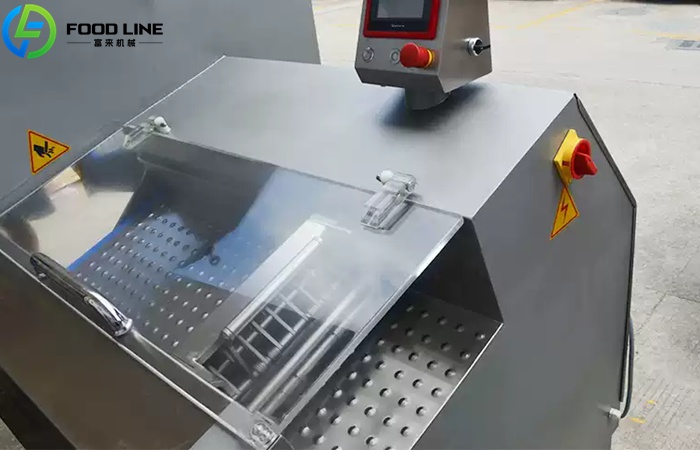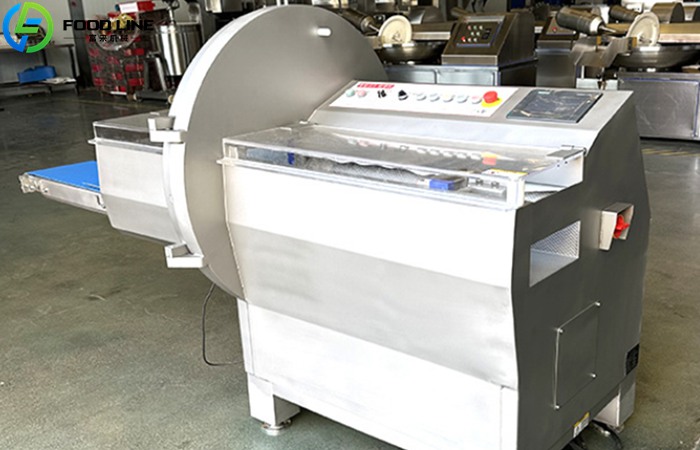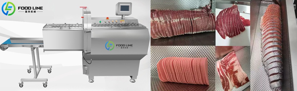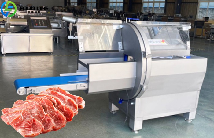 The machine uses a powerful motor and a razor-sharp rotating blade to cut meat blocks into slices of adjustable thickness. Operators can set precise slice sizes — from paper-thin cuts for deli meats to thicker portions for steaks or jerky production.