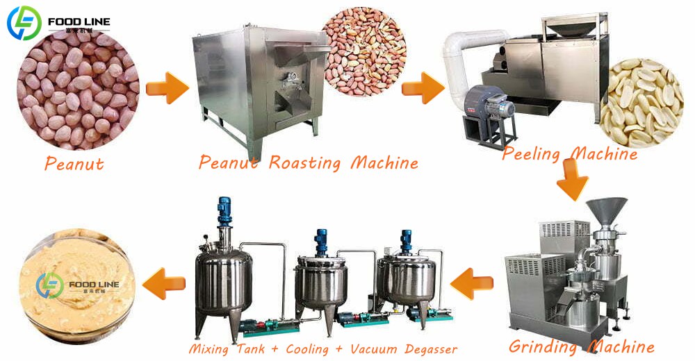 Looking for a complete peanut butter production solution? Foodline Machinery provides a fully integrated peanut butter processing line, covering raw peanut handling, roasting, grinding, mixing, filling, and packing—all designed for commercial and industrial peanut butter manufacturers.